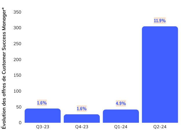 Avec 8 fois plus d’offres publiées ce Q2, en année glissante, l’ascension spectaculaire du poste de Customer Success (CS) est indéniable. Nombreuses sont les Techs cherchant à recruter et consolider leur équipe après vente, puisqu’il concentre à lui seul 12% des offres d’emploi de Sales du marché – un record ! Longtemps perçu comme un simple coût, le rôle de Customer Success Manager s’impose désormais comme un levier stratégique de croissance à long terme. En misant sur des stratégies d’expansion et de fidélisation plus proactives, ce métier apparait aujourd’hui comme un centre de profit indispensable. Dans son rôle pivot, son impact est notable tant sur la réduction du churn que l’augmentation de la valeur client via l’engagement et l’upselling,