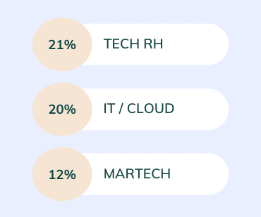 3 types de décideurs représentent 53% du marché des offres d’emploi. Alors que le secteur de l’IT a toujours dominé, deux verticales intéressantes se démarquent ce Q2. Tendance surprenante, le secteur de la Tech RH domine, en concentrant 1 offre sur 5 sur le marché. Cette dynamique est notamment portée par la Tech américaine Deel qui recrute massivement en remote, suivie de la start-up française Lucca, ou encore Workday et Flatchr. Les 4 licornes françaises de la Tech RH (Spendesk, Alan, Swile, Payfit) suivent de près, en restant plus prudentes ce trimestre. Enfin, les éditeurs de logiciels destinés au Marketing (Martech) se distinguent avec des Techs américaines de renoms tels que HubSpot et Adobe, ou encore la licorne française Contentsquare, qui accélèrent leurs recrutements ce Q2.