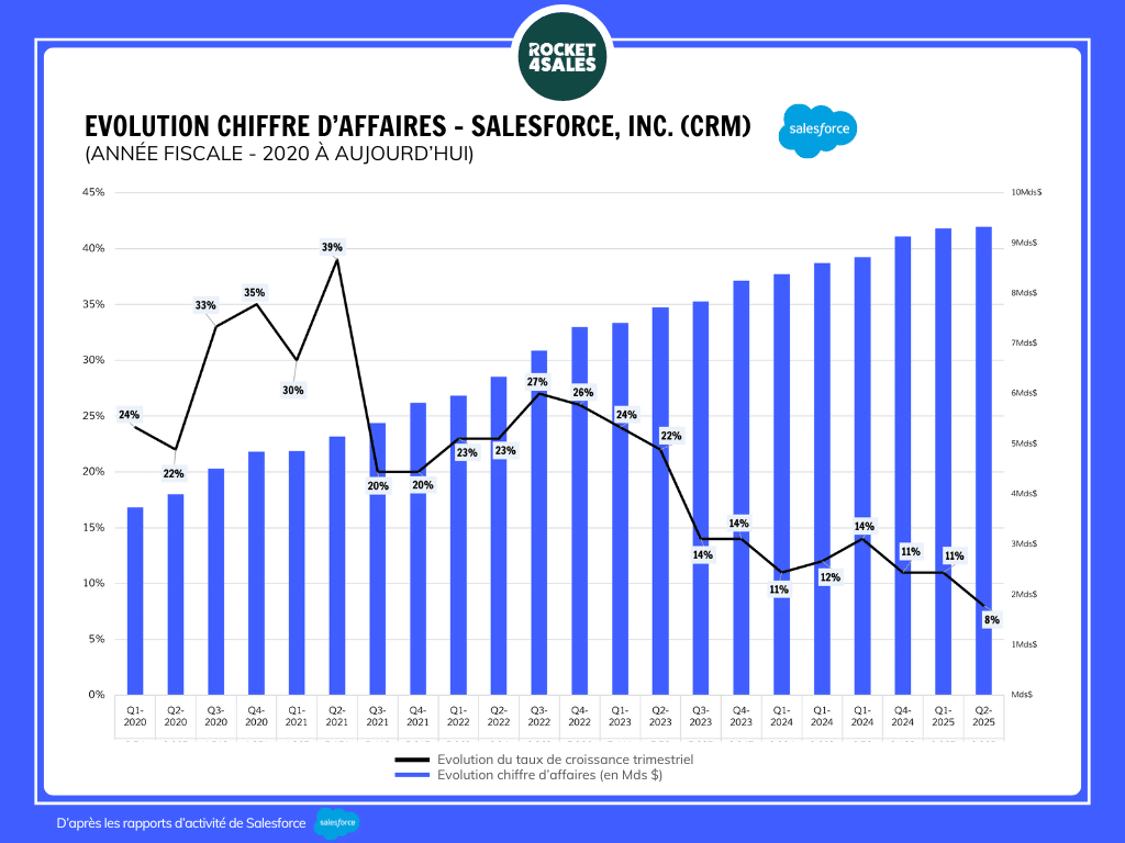 Aujourd’hui, Salesforce présente des résultats plus rassurants au Q2, bien que des interrogations demeurent sur la capacité de l’entreprise à maintenir une croissance soutenue à long terme.