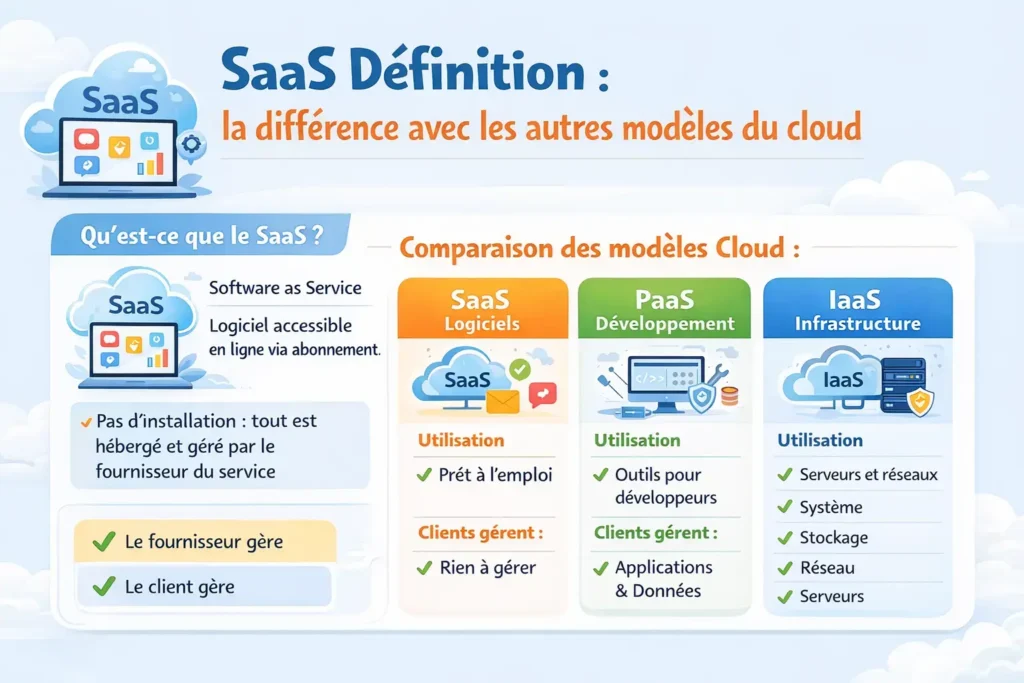 | SaaS | Fournisseur externe | Utilisation applicative uniquement | Salesforce, Google Workspace, Microsoft 365 |