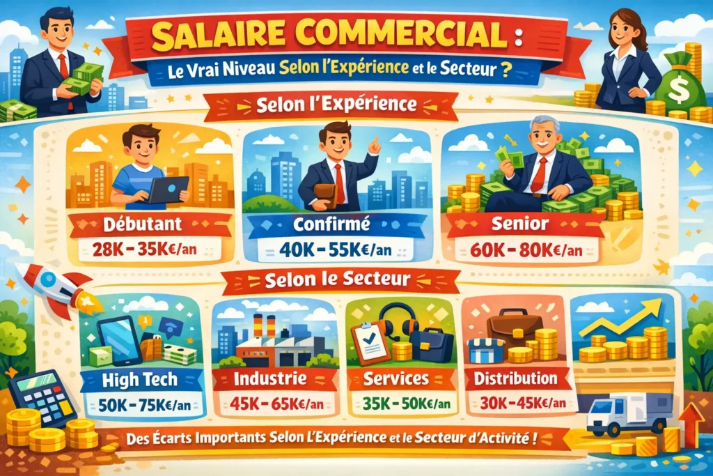 Le commercial débutant touche en moyenne 25 000 € à 35 000 € brut annuel selon le secteur. La variation se lit entre commercial terrain commercial sédentaire et profil technico-commercial. Vous observez une différence nette entre Paris et une ville de province sur la même fiche de poste. Ce brut correspond souvent à 1 700 € à 2 300 € net mensuel selon le prélèvement.